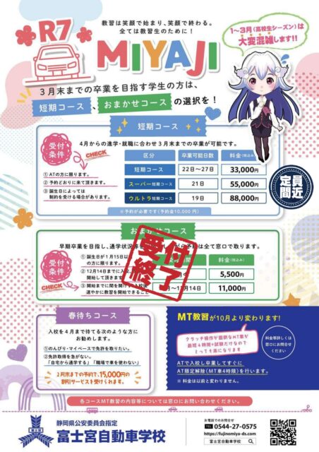 ※短期コースは申し込み用紙の記入と予約金(10,000円)が必要です。(予約金は、教習料金へお振替いたします。(短期コース詳細)